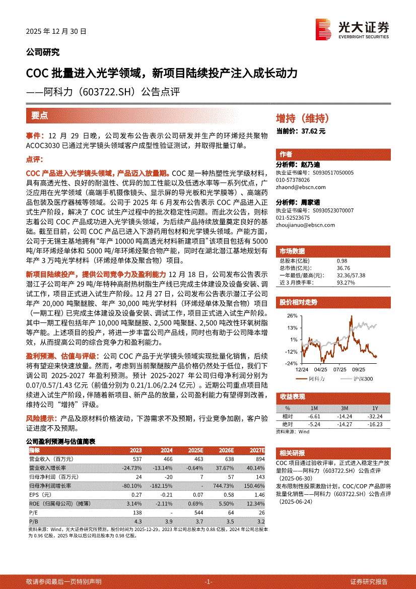 阿科力:光大证券-阿科力-603722-公告点评:COC批量进入光学领域,新项目陆续投产注入成长动力-251230