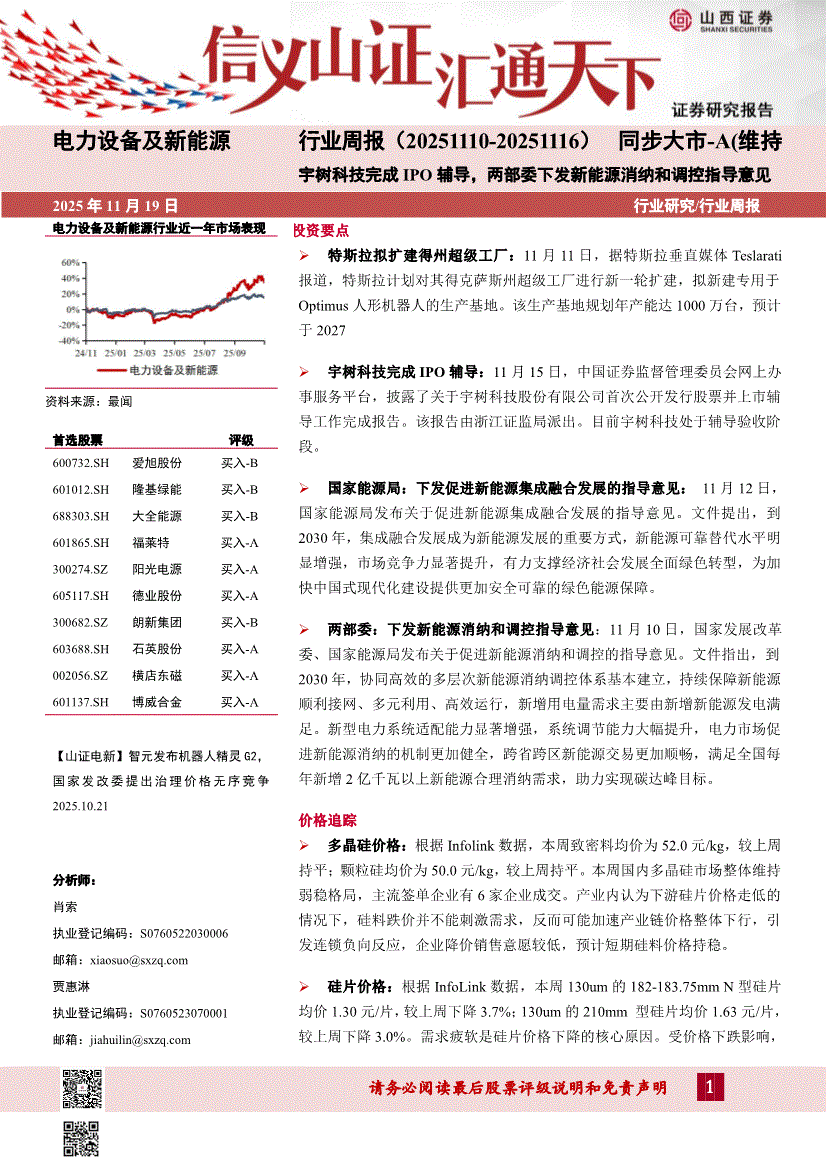 电力设备及新能源行业:山西证券-电力设备及新能源行业周报:宇树科技完成IPO辅导,两部委下发新能源消纳和调控指导意见-251119