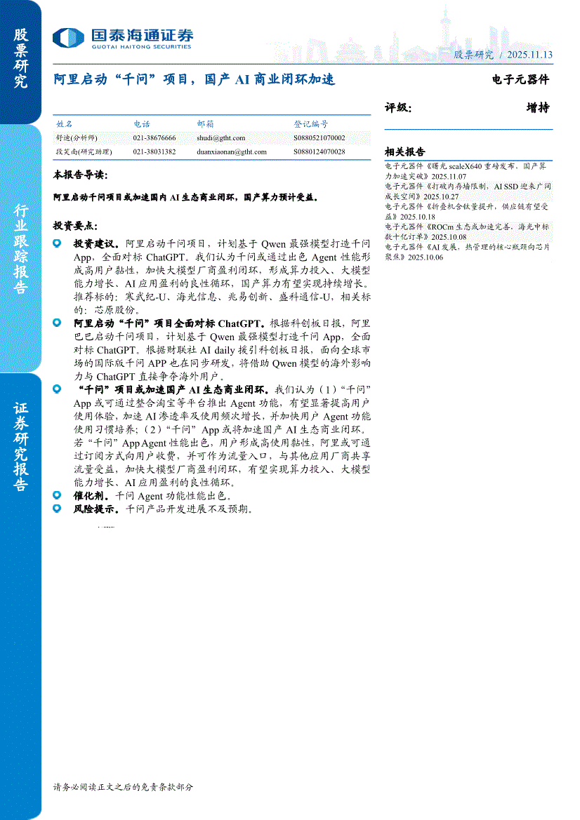 国泰海通证券-电子元器件行业跟踪报告:阿里启动“千问”项目,国产AI商业闭环加速-251113