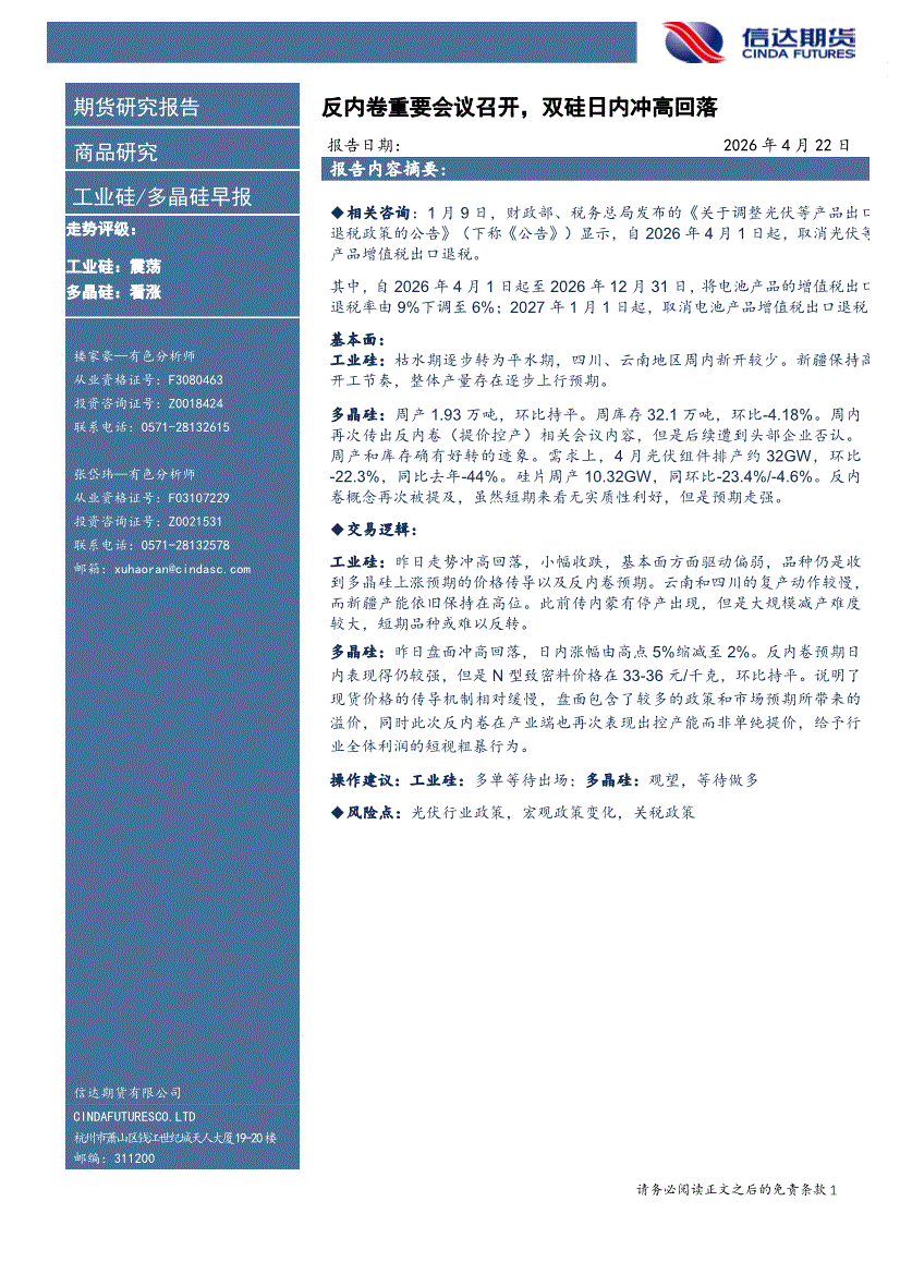 信达期货-工业硅/多晶硅早报:反内卷重要会议召开,双硅日内冲高回落-260422
