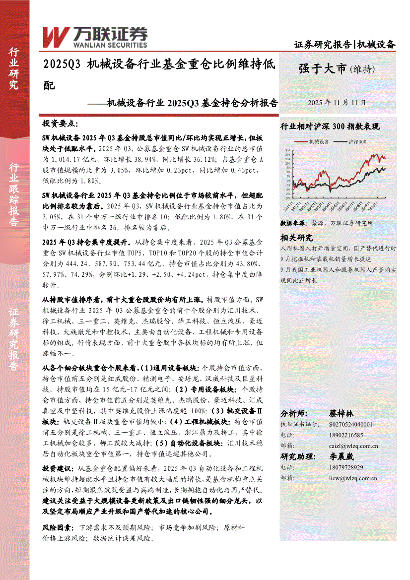 机械设备行业:万联证券-机械设备行业2025Q3基金持仓分析报告:2025Q3机械设备行业基金重仓比例维持低配-251111