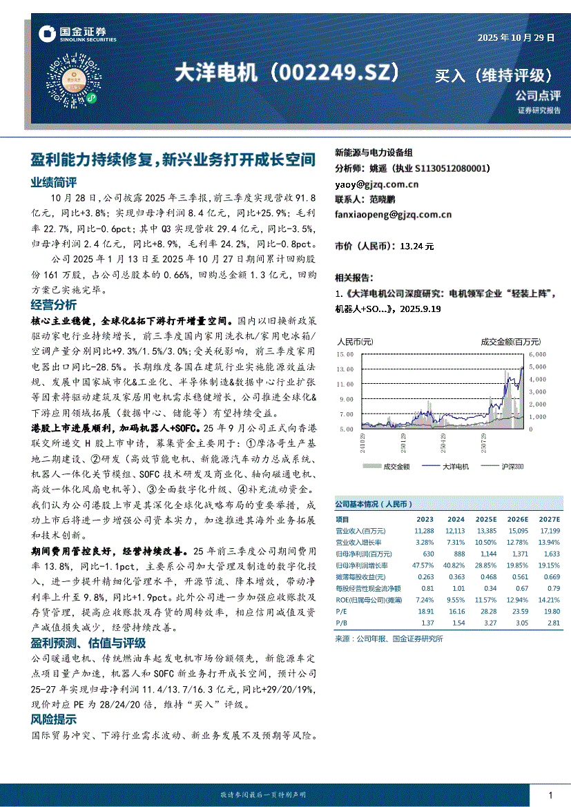 大洋电机:国金证券-大洋电机-002249-盈利能力持续修复,新兴业务打开成长空间-251029