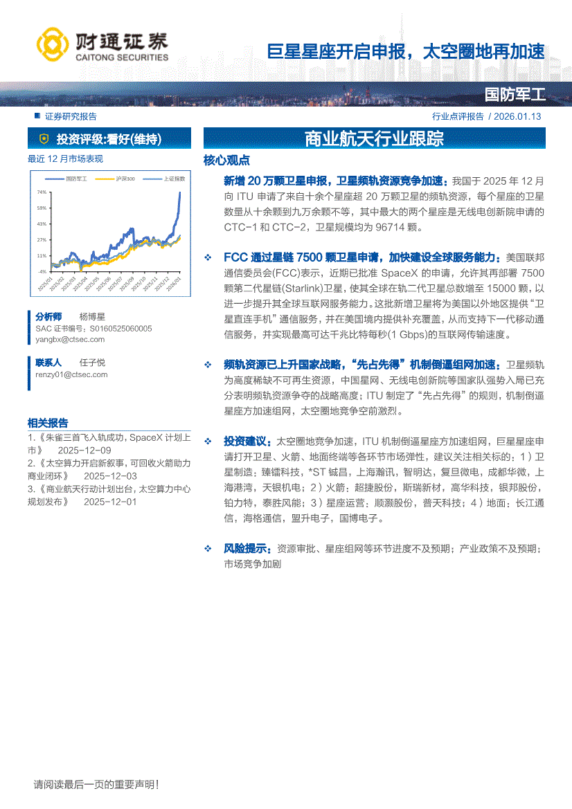 商业航天行业:财通证券-商业航天行业跟踪:巨星星座开启申报,太空圈地再加速-260113
