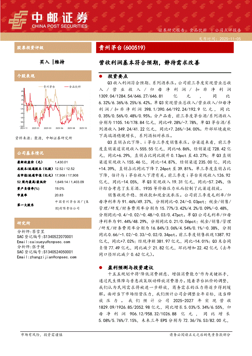 贵州茅台:中邮证券-贵州茅台-600519-营收利润基本符合预期,静待需求改善-251105