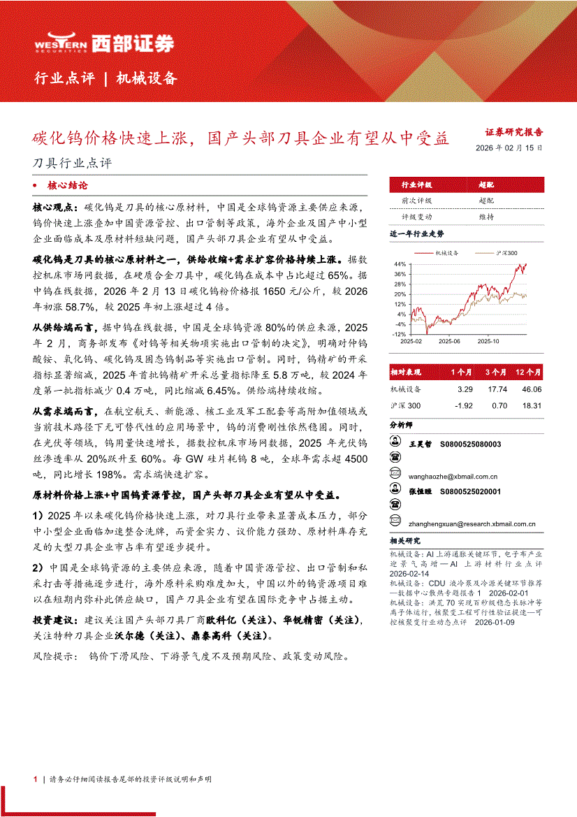 刀具行业:西部证券-刀具行业点评:碳化钨价格快速上涨,国产头部刀具企业有望从中受益-260215