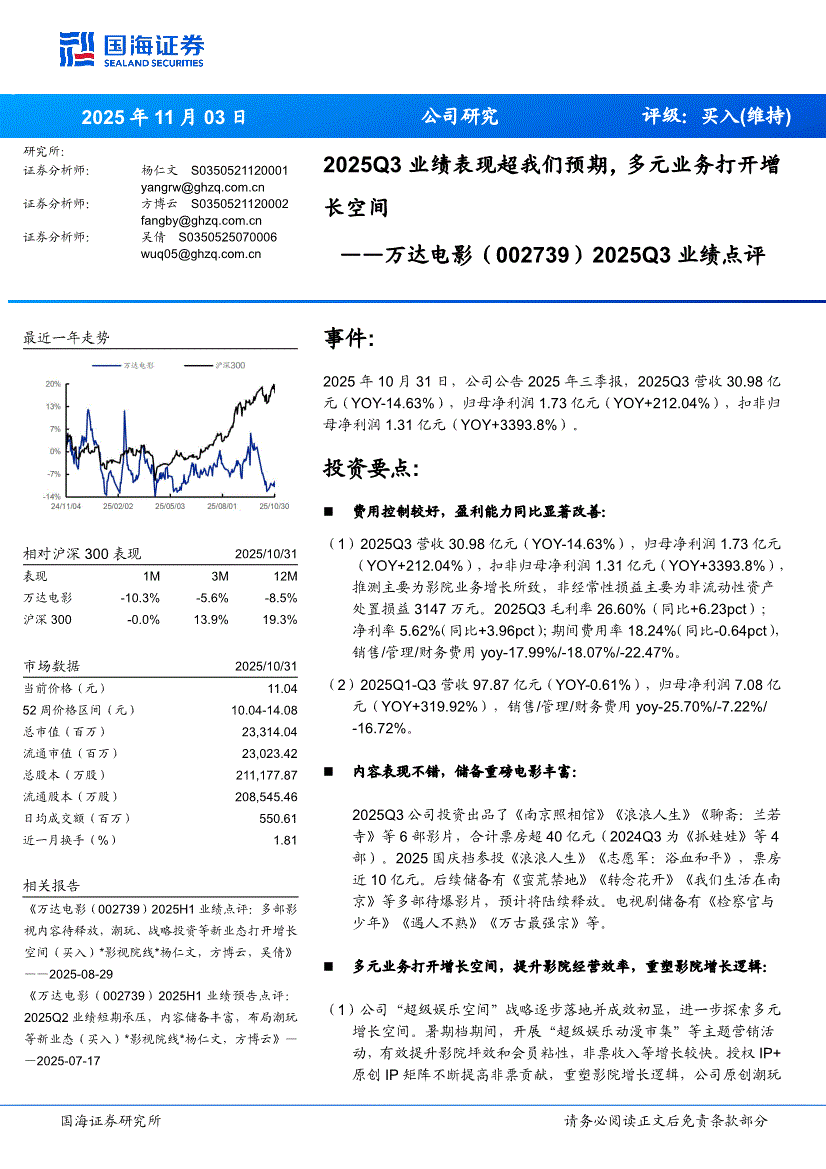 万达电影:国海证券-万达电影-002739-2025Q3业绩点评,2025Q3业绩表现超我们预期,多元业务打开增长空间-251103