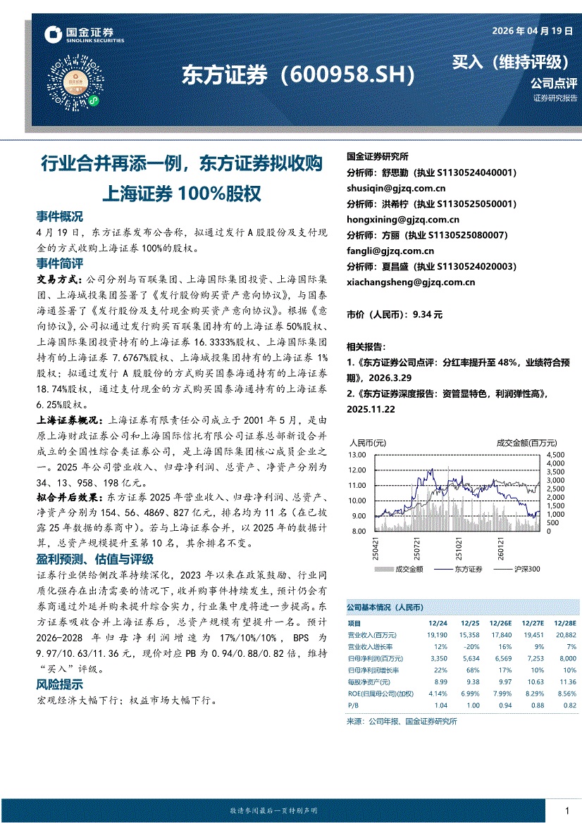 东方证券:国金证券-东方证券-600958-行业合并再添一例,东方证券拟收购上海证券100%股权-260419