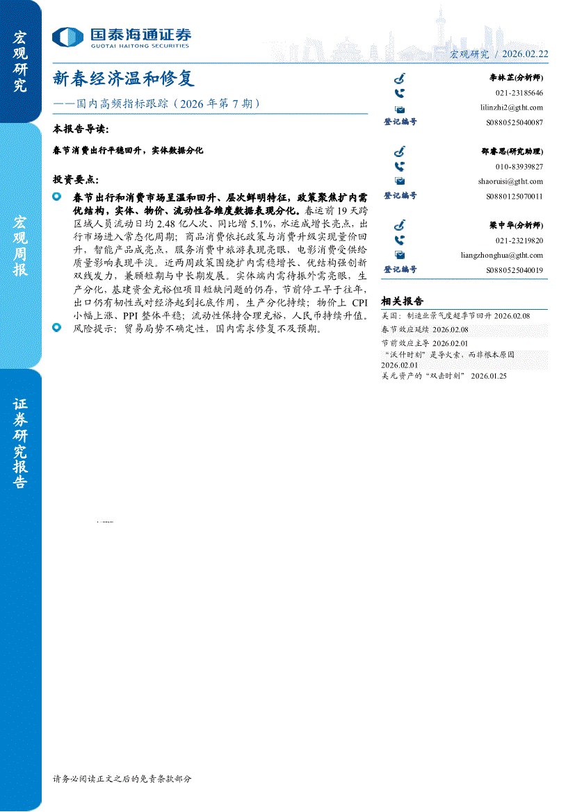 国泰海通证券-国内高频指标跟踪(2026年第7期):新春经济温和修复-260222