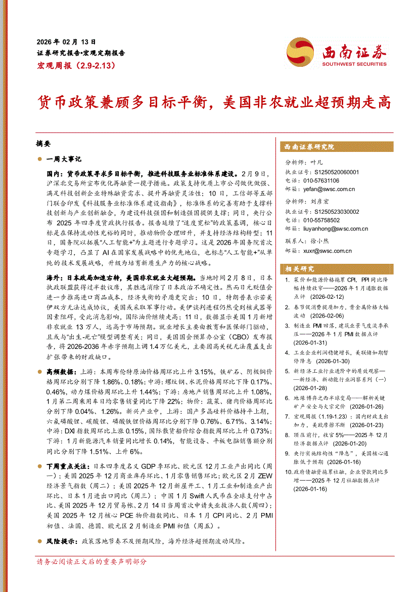 西南证券-宏观周报(2.9~2.13):货币政策兼顾多目标平衡,美国非农就业超预期走高-260213