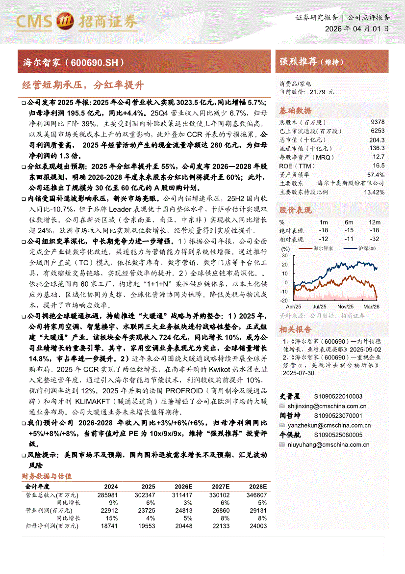 海尔智家:招商证券-海尔智家-600690-经营短期承压,分红率提升-260401