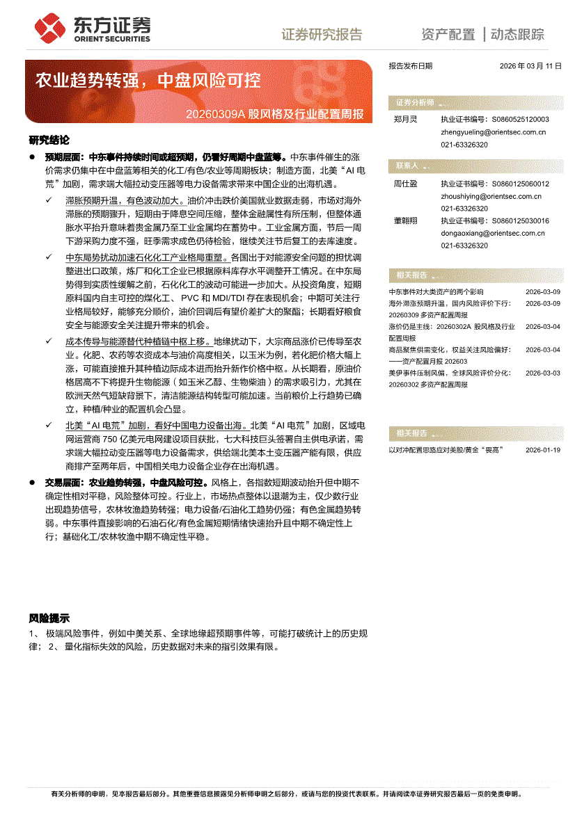 东方证券-A股风格及行业配置周报:农业趋势转强,中盘风险可控-260311