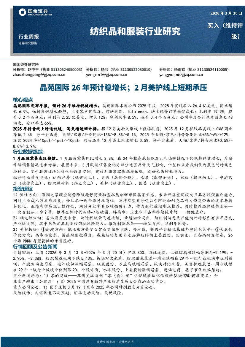 纺织品和服装行业:国金证券-纺织品和服装行业周报:晶苑国际26年预计稳增长;2月美护线上短期承压-260320