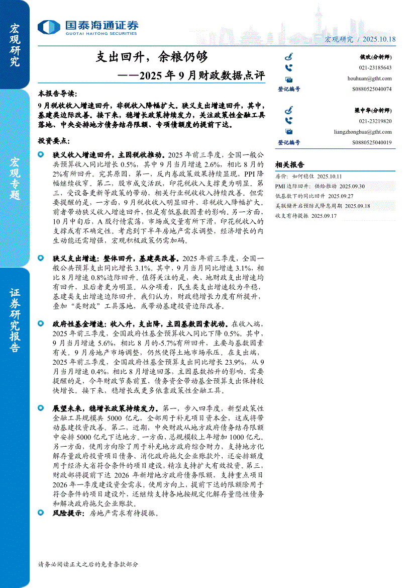 国泰海通证券-2025年9月财政数据点评:支出回升,余粮仍够-251018