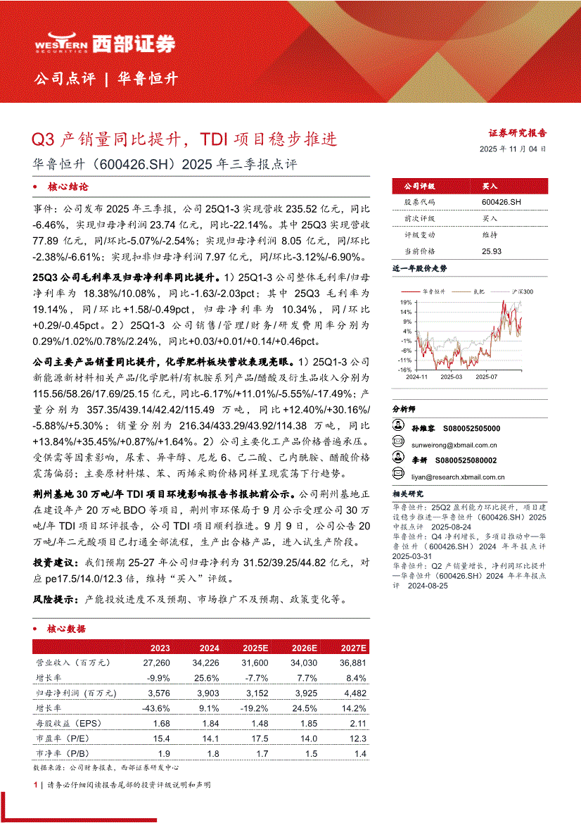 华鲁恒升:西部证券-华鲁恒升-600426-2025年三季报点评:Q3产销量同比提升,TDI项目稳步推进-251104