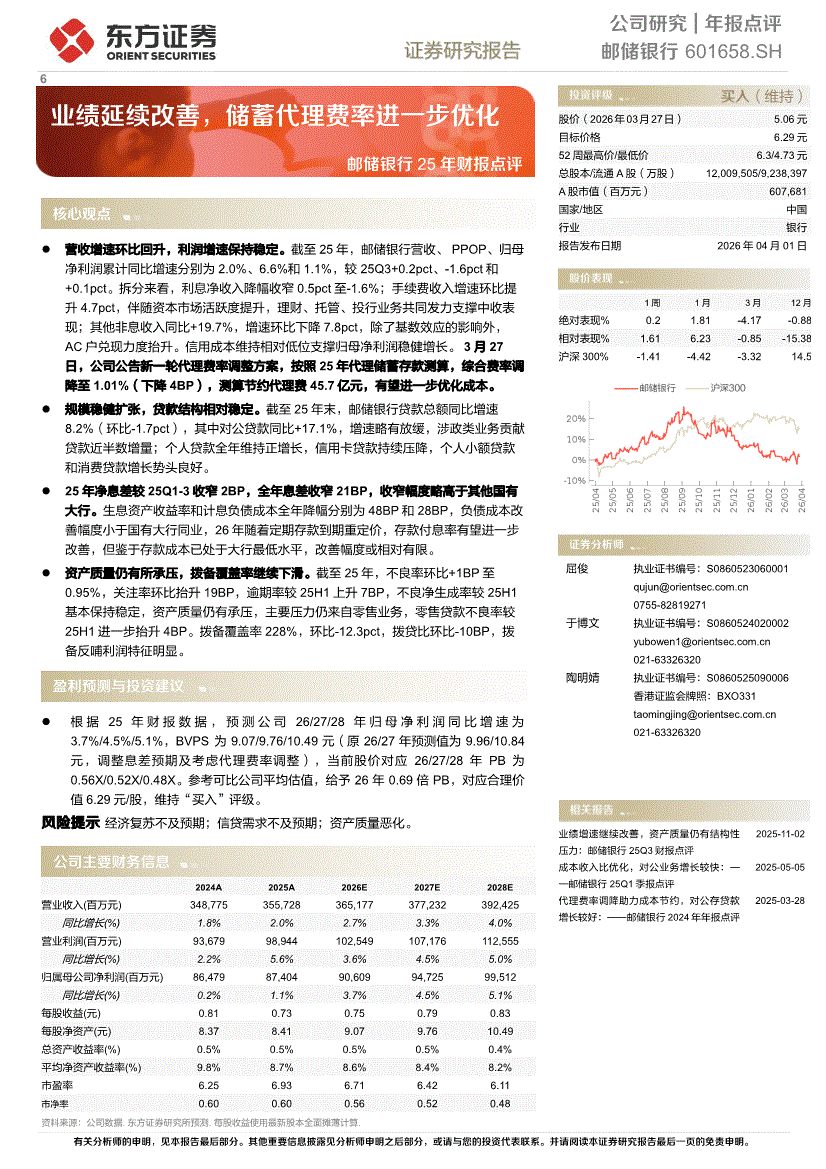 邮储银行:东方证券-邮储银行-601658-25年财报点评:业绩延续改善,储蓄代理费率进一步优化-260401