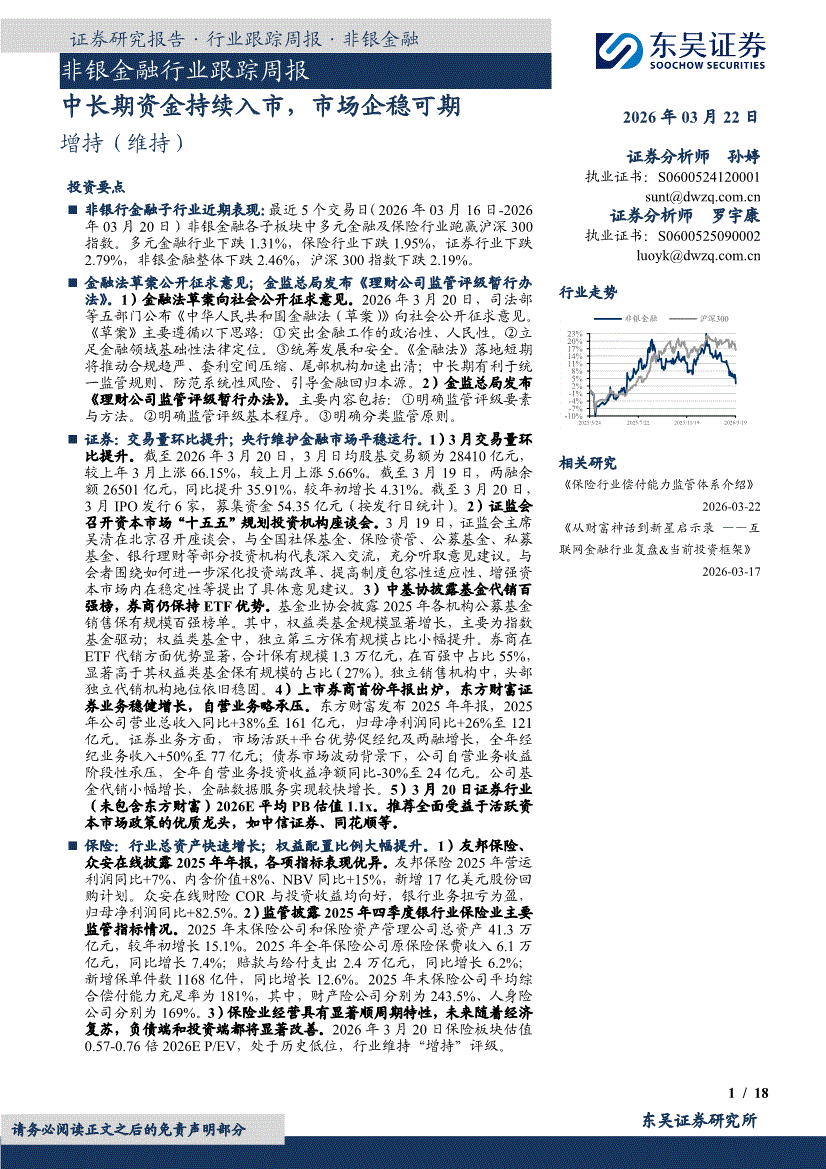 非银金融行业:东吴证券-非银金融行业跟踪周报:中长期资金持续入市,市场企稳可期-260322