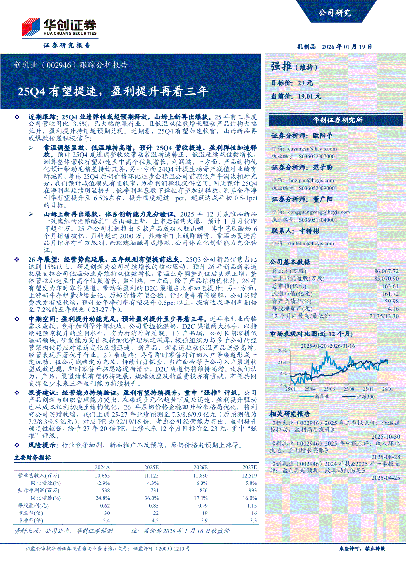 新乳业:华创证券-新乳业-002946-跟踪分析报告:25Q4有望提速,盈利提升再看三年-260119