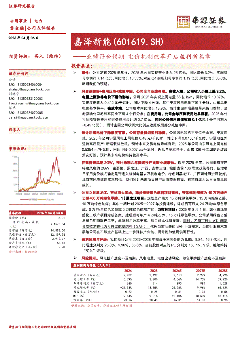 嘉泽新能:华源证券-嘉泽新能-601619-业绩符合预期,电价机制改革开启盈利新篇章-260406