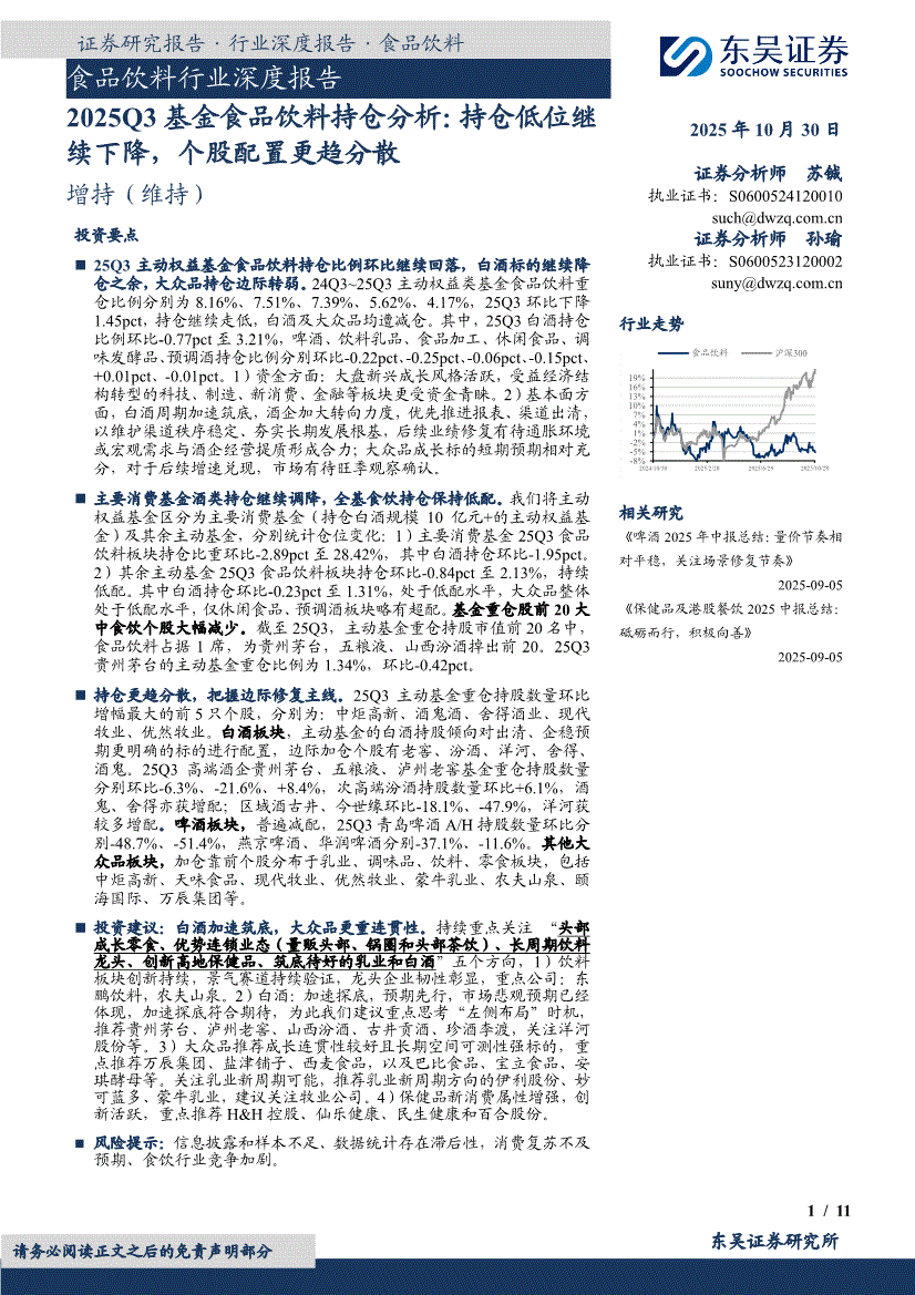 食品饮料行业:东吴证券-食品饮料行业深度报告:2025Q3基金食品饮料持仓分析,持仓低位继续下降,个股配置更趋分散-251030