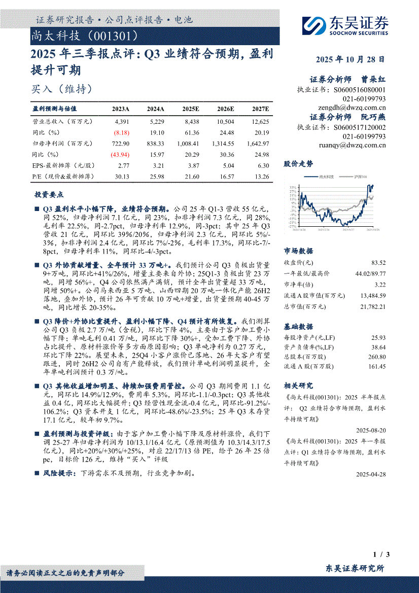 尚太科技:东吴证券-尚太科技-001301-2025年三季报点评:Q3业绩符合预期,盈利提升可期-251028