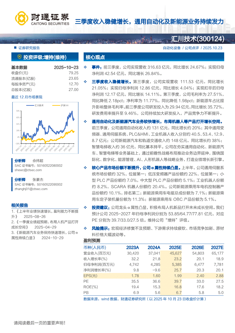 汇川技术:财通证券-汇川技术-300124-三季度收入稳健增长,通用自动化及新能源业务持续发力-251023