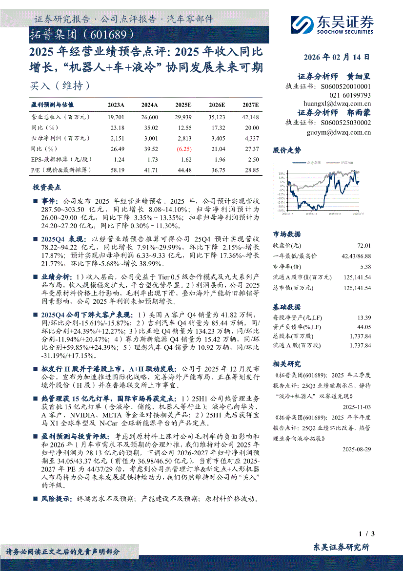 拓普集团:东吴证券-拓普集团-601689-2025年经营业绩预告点评:2025年收入同比增长,“机器人+车+液冷”协同发展未来可期-260214
