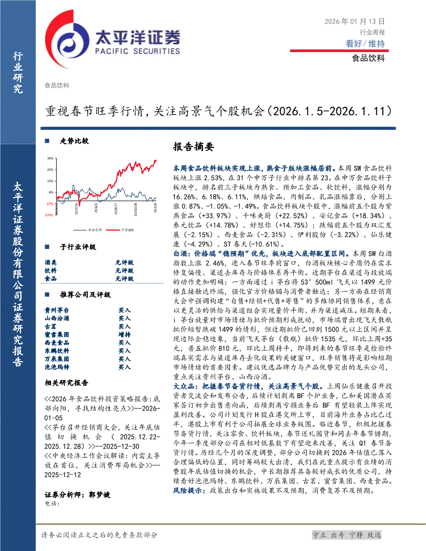 食品饮料行业:太平洋证券-食品饮料行业周报:重视春节旺季行情,关注高景气个股机会-260113