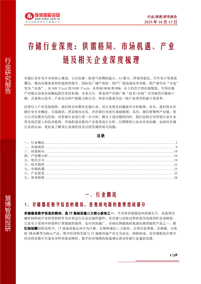 存储行业:慧博智能投研-存储行业深度:供需格局、市场机遇、产业链及相关企业深度梳理-251013