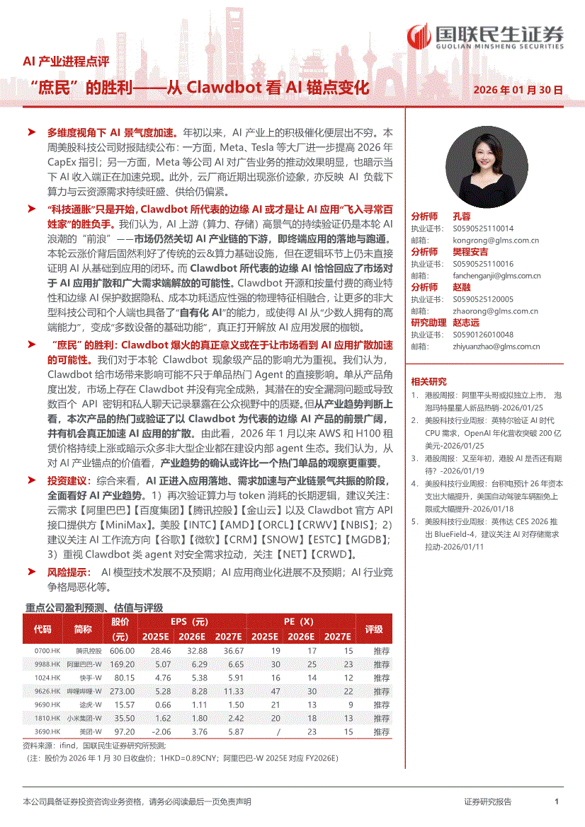 AI行业:国联民生证券-AI产业进程点评:“庶民”的胜利——从Clawdbot看AI锚点变化-260130