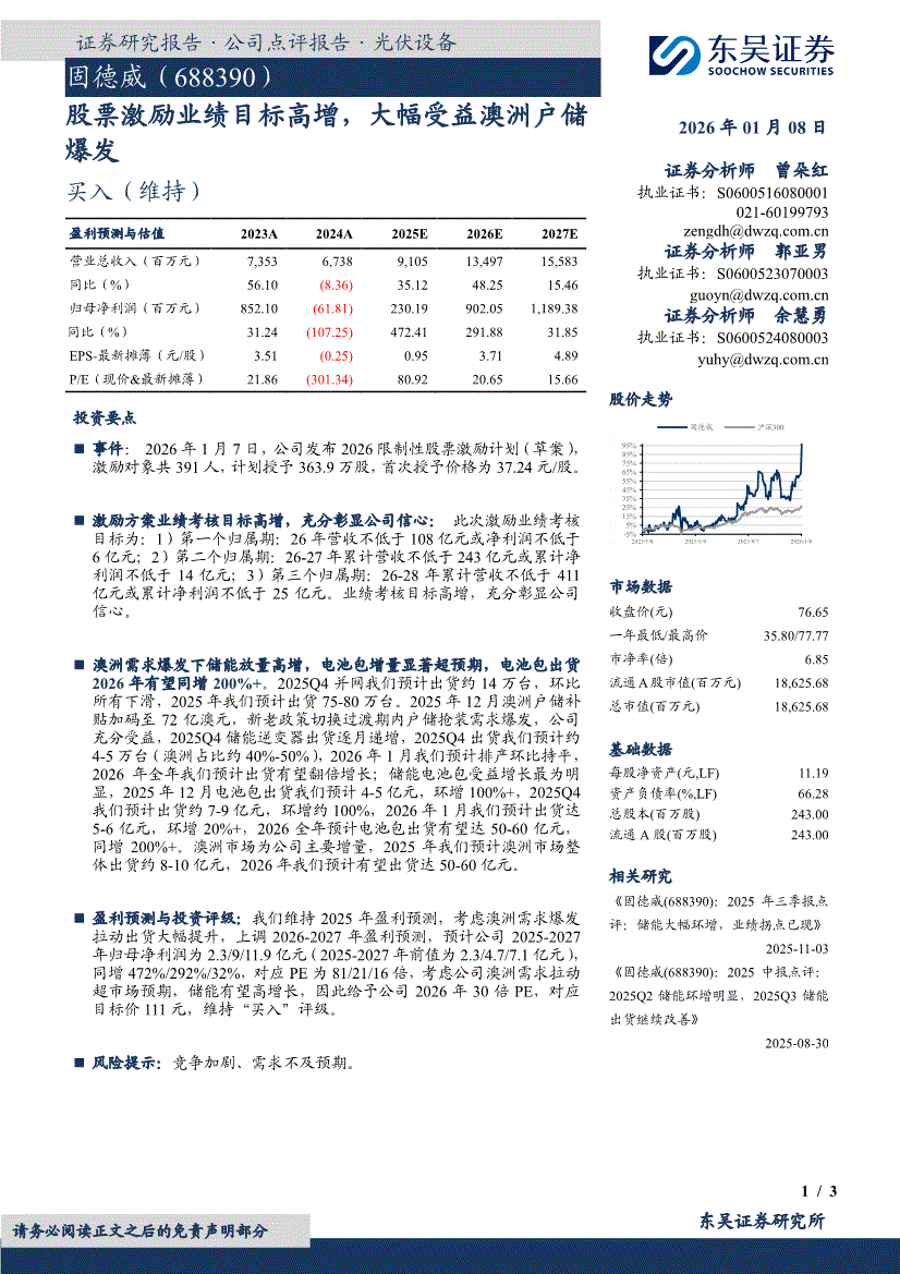 固德威:东吴证券-固德威-688390-股票激励业绩目标高增,大幅受益澳洲户储爆发-260108