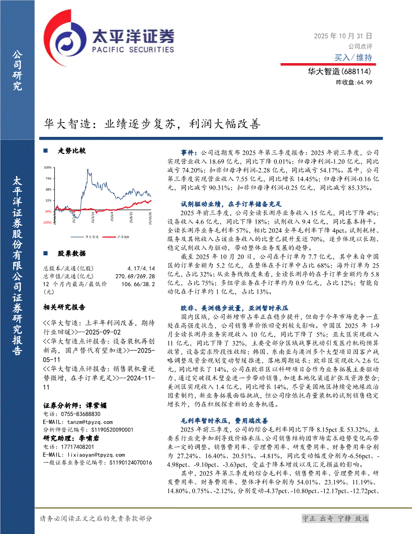 华大智造:太平洋证券-华大智造-688114-业绩逐步复苏,利润大幅改善-251031