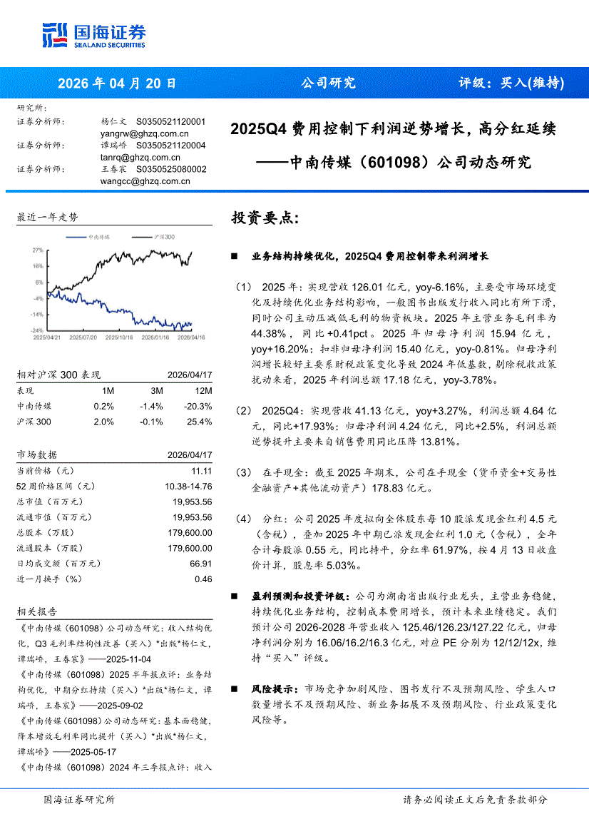 中南传媒:国海证券-中南传媒-601098-公司动态研究:2025Q4费用控制下利润逆势增长,高分红延续-260420