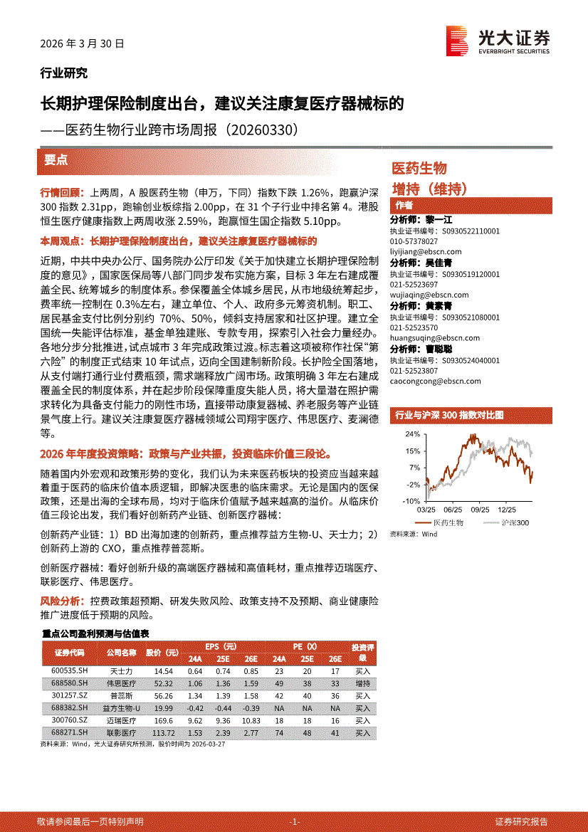 医药生物行业:光大证券-医药生物行业跨市场周报:长期护理保险制度出台,建议关注康复医疗器械标的-260330