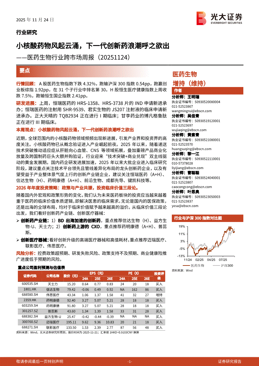 医药生物行业:光大证券-医药生物行业跨市场周报:小核酸药物风起云涌,下一代创新药浪潮呼之欲出-251124