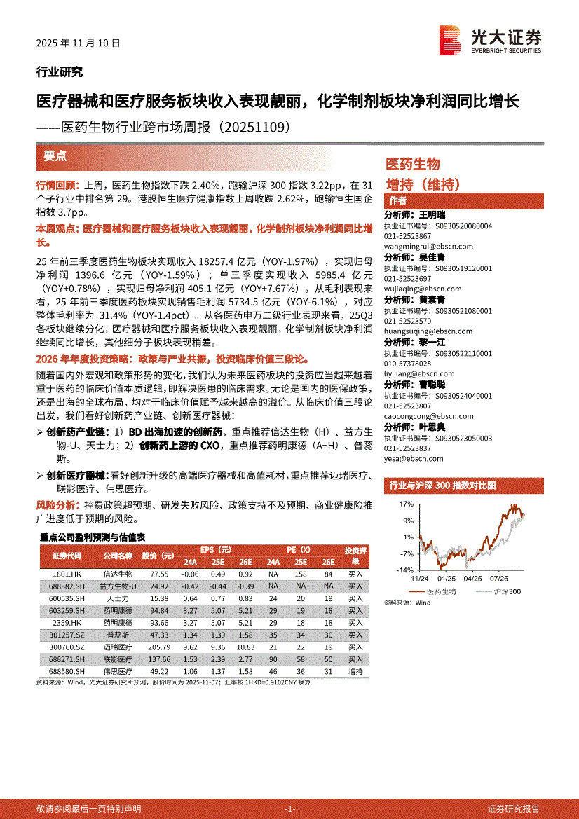 医药生物行业:光大证券-医药生物行业跨市场周报:医疗器械和医疗服务板块收入表现靓丽,化学制剂板块净利润同比增长-251110