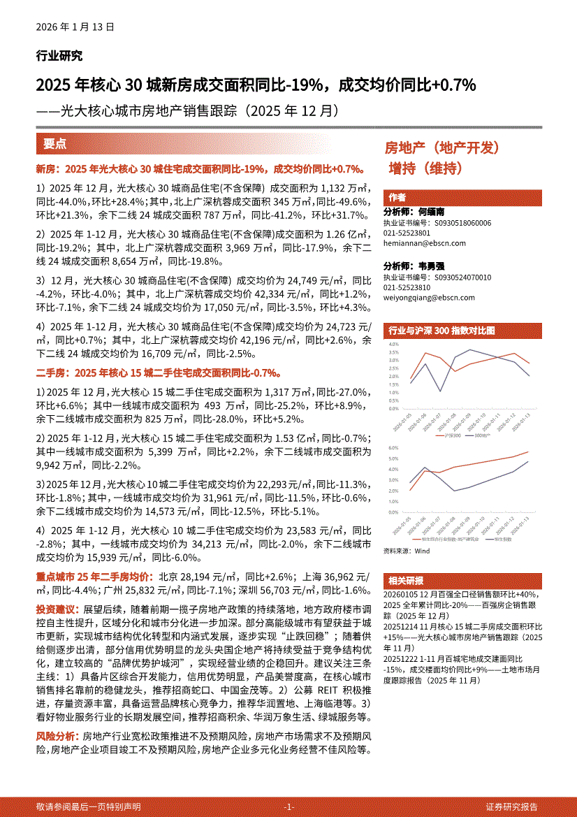 房地产行业:光大证券-房地产行业核心城市房地产销售跟踪(2025年12月):2025年核心30城新房成交面积同比下降19%,成交均价同比+0.7%-260113