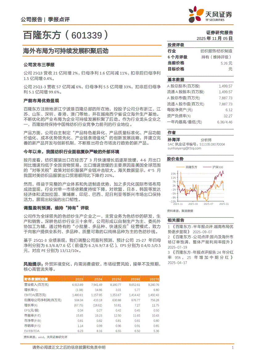 百隆东方:天风证券-百隆东方-601339-海外布局为可持续发展积聚后劲-251105