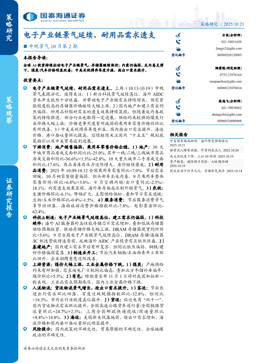 国泰海通证券-中观景气10月第2期:电子产业链景气延续,耐用品需求透支-251023