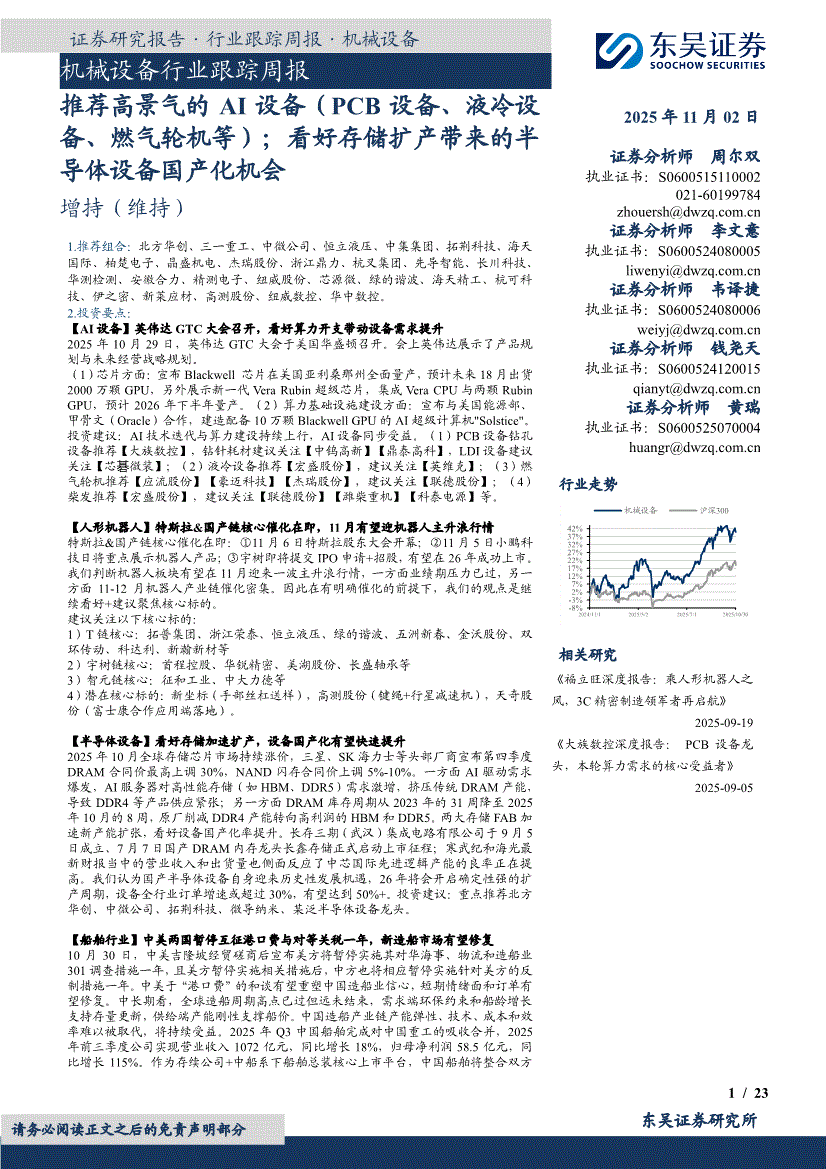 机械设备行业:东吴证券-机械设备行业跟踪周报:推荐高景气的AI设备(PCB设备、液冷设备、燃气轮机等);看好存储扩产带来的半导体设备国产化机会-251102