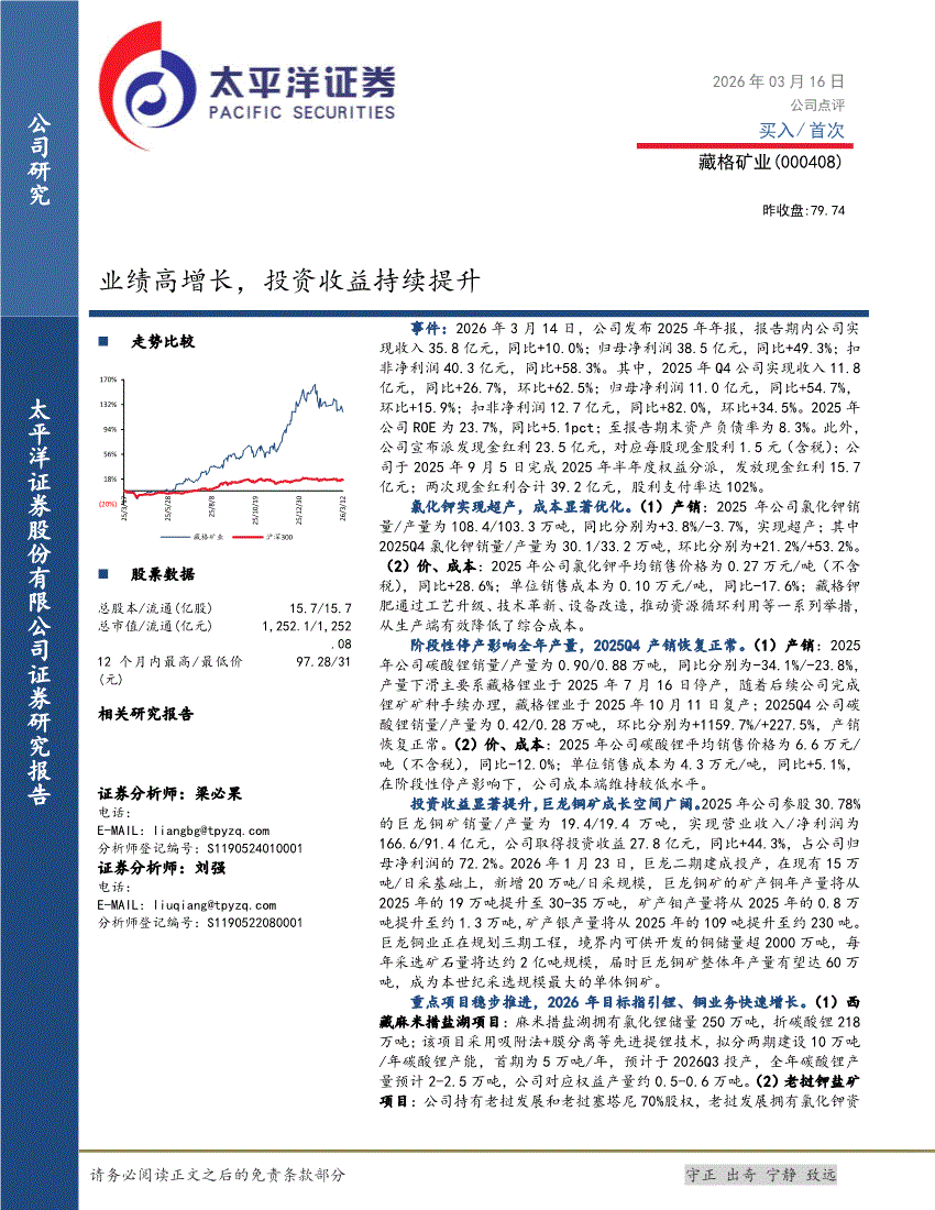 藏格矿业:太平洋证券-藏格矿业-000408-业绩高增长,投资收益持续提升-260316