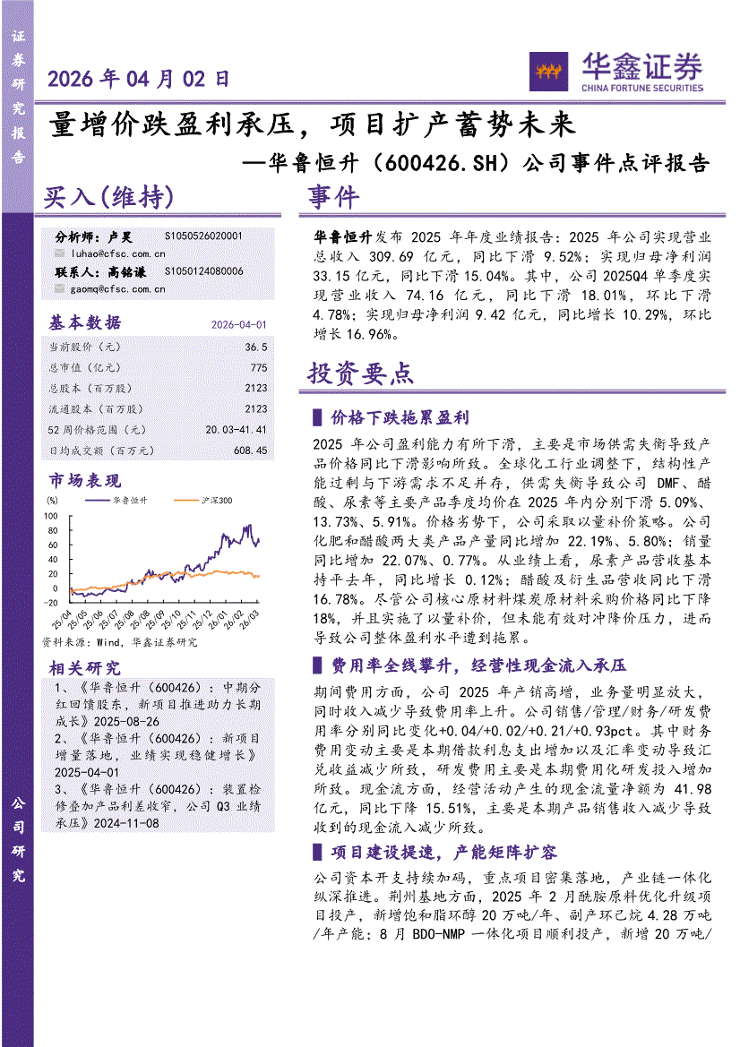 华鲁恒升:华鑫证券-华鲁恒升-600426-公司事件点评报告:量增价跌盈利承压,项目扩产蓄势未来-260402