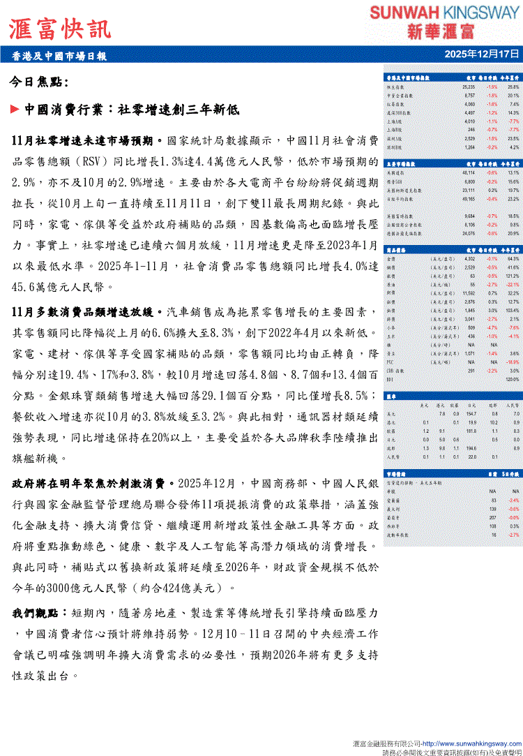 新华汇富-汇富快讯:香港及中国市场日报-251217