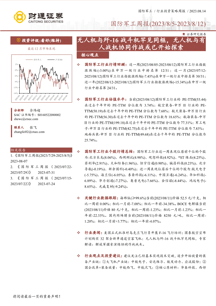 国防军工行业:财通证券-国防军工行业周报:无人机与歼~16战斗机罕见同框,无人机与有人战机协同作战或已开始探索-230814
