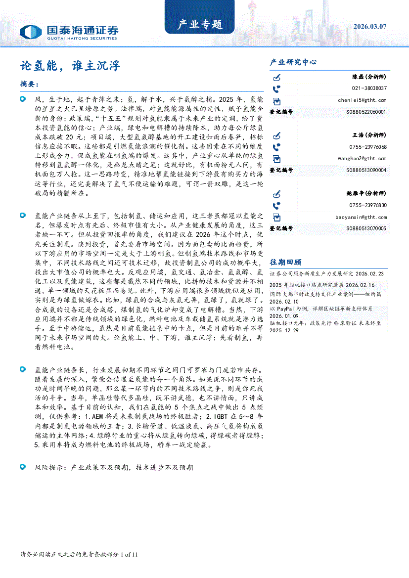 国泰海通证券-产业专题:论氢能,谁主沉浮-260307