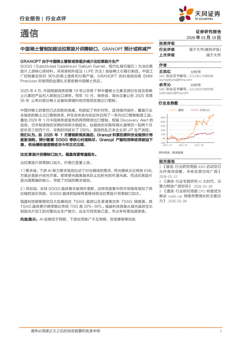 通信行业:天风证券-通信行业:中国稀土管制加剧法拉第旋片供需缺口,GRANOPT预计或将减产-260119