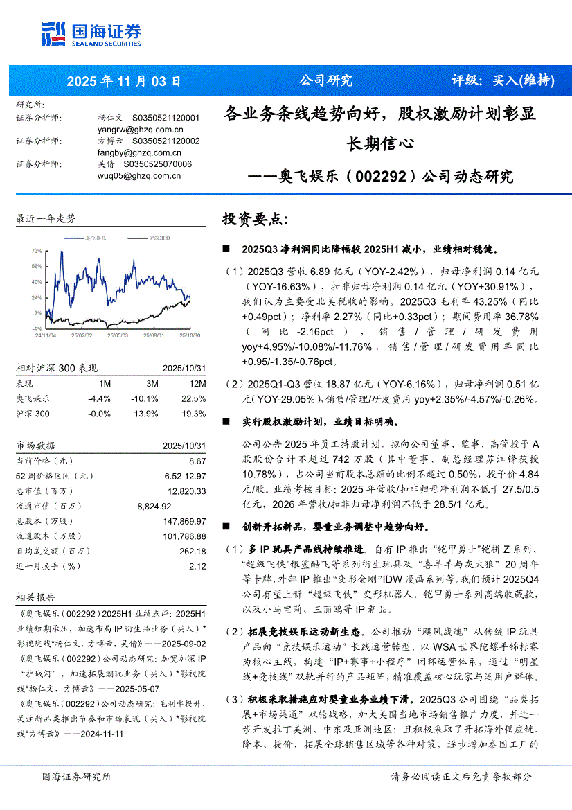 奥飞娱乐:国海证券-奥飞娱乐-002292-公司动态研究:各业务条线趋势向好,股权激励计划彰显长期信心-251103