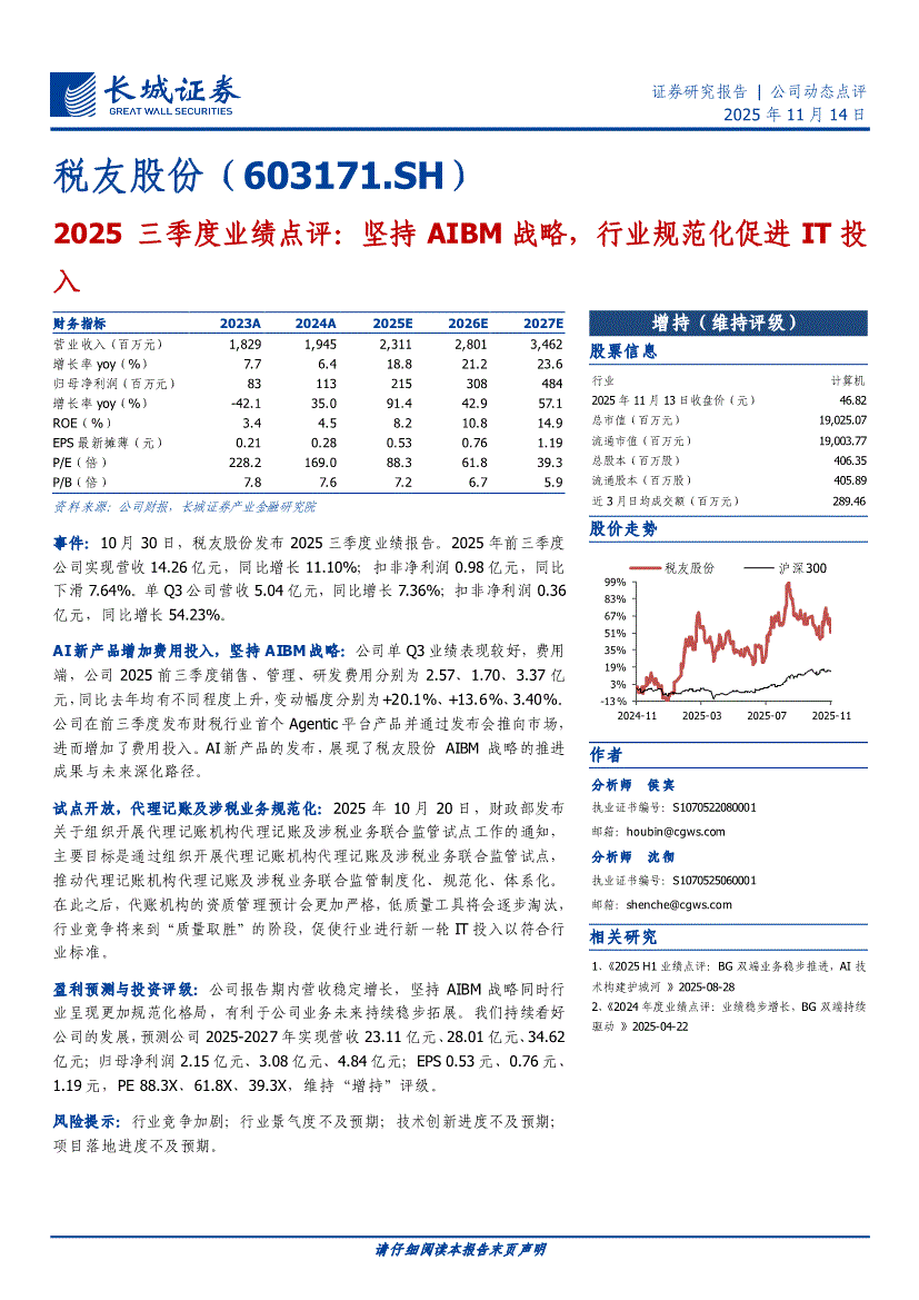 税友股份:长城证券-税友股份-603171-2025三季度业绩点评:坚持AIBM战略,行业规范化促进IT投入-251114