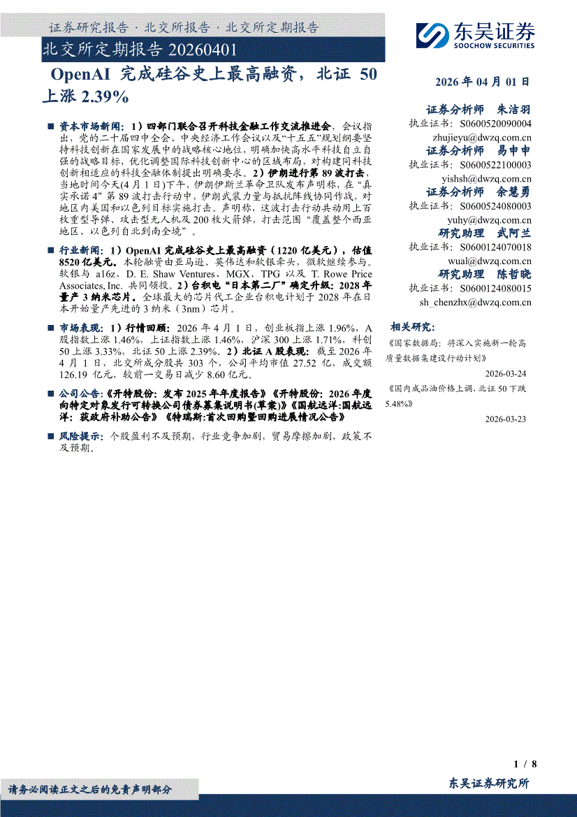 东吴证券-北交所定期报告:OpenAI完成硅谷史上最高融资,北证50上涨2.39%-260401