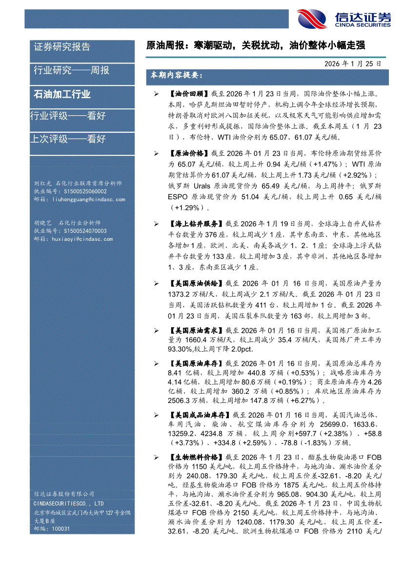 石油加工行业:信达证券-石油加工行业原油周报:寒潮驱动,关税扰动,油价整体小幅走强-260125
