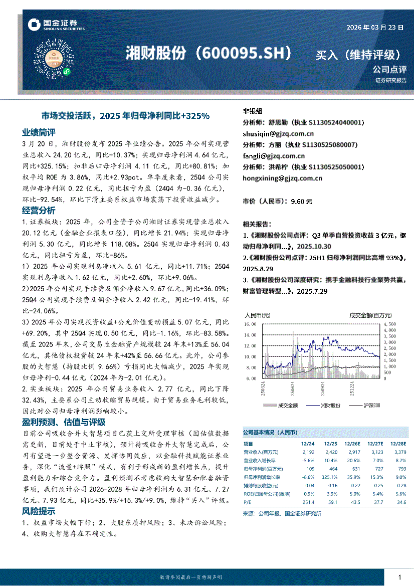湘财股份:国金证券-湘财股份-600095-市场交投活跃,2025年归母净利同比+325%-260323